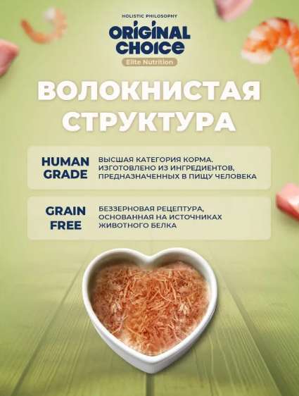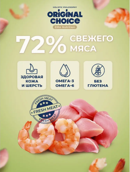 Откройте новый уровень вкуса и заботы о Вашем питомце с ORIGINAL CHOICE Elite Nutrition Adult! Этот изысканный корм содержит нежное филе индейки и креветки в аппетитном желе.
