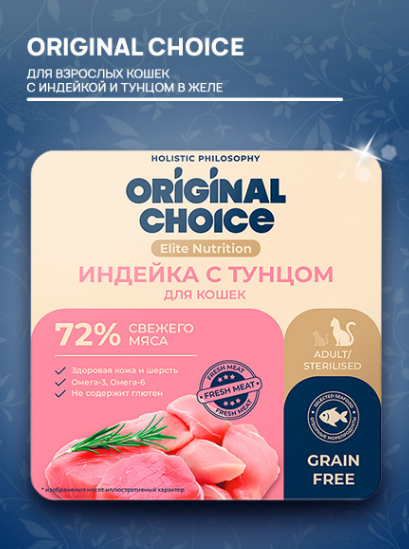 Откройте новый уровень вкуса и заботы о Вашем питомце с Original Choice Elite Nutrition Adult! Этот изысканный корм содержит нежное филе индейки и тунца в аппетитном желе.