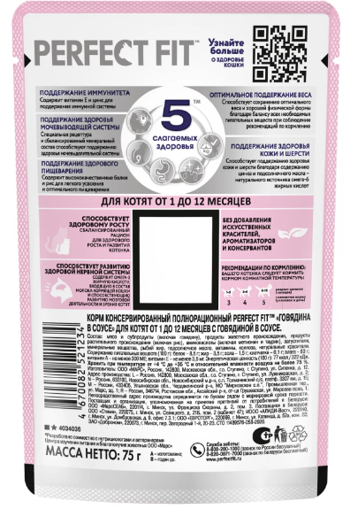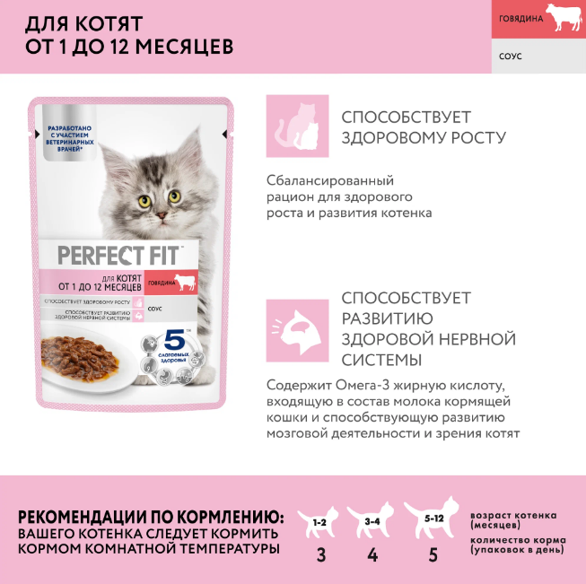 Влажный корм в паучах PERFECT FIT™ с говядиной в соусе для котят разработан с учетом потребностей молодого растущего организма.