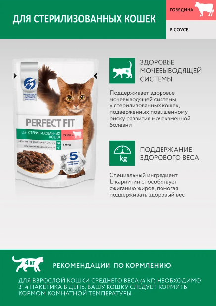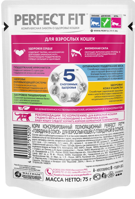 Высококачественный полноценный рацион для взрослых кошек с говядиной в соусе разработан специально для поддержания здоровья и хорошего самочувствия взрослых кошек. НЕ содержит ароматизаторов, красителей И консервантов. Ключевые особенности: Здоровье сердца. Содержит таурин, незаменимую для кошек аминокислоту, помогающую поддерживать сердце здоровым. Гладкая шерсть и здоровая кожа. Способствует поддержанию здоровья кожи и шерсти благодаря содержанию цинка и подсолнечного масла, натурального источника омега-6 жирных кислот. PERFECT FIT это система профессионального питания, которая создано специально для поддержания здоровья кошек, чтобы они оставались активными, игривыми и получали максимум от каждого дня на протяжении всей жизни. Благодаря уникальной формуле 5 слагаемых здоровья PERFECT FIT заботится о важнейших составляющих хорошего самочувствия кошки и помогает ей всегда быть полной жизненных сил: Поддержание естественной защиты организма. Таурин, витамины С и Е для поддержания естественной защиты организма. Поддержание здоровья мочевыводящей системы. Баланс минералов, помогающий поддержанию здоровья мочевыводящей системы и снижению риска формирования камней в почках.