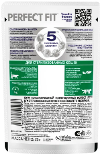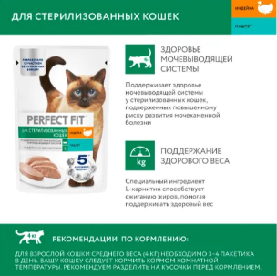 Влажный корм в паучах PERFECT FIT™ паштет с индейкой для стерилизованных кошек разработан по специальной рецептуре для контроля здоровья кошек, прошедших стерилизацию. Здоровье мочевыводящей системы. Поддерживает здоровье мочевыводящей системы у стерилизованных кошек, подверженных повышенному риску развития мочекаменной болезни. Поддержание здорового веса. Специальный ингредиент L-карнитин способствует сжиганию жиров, помогая поддерживать здоровый вес.