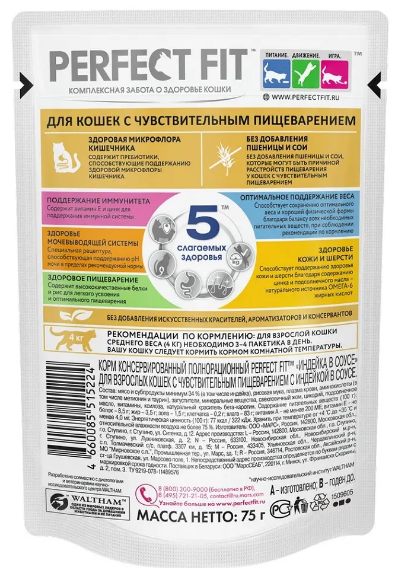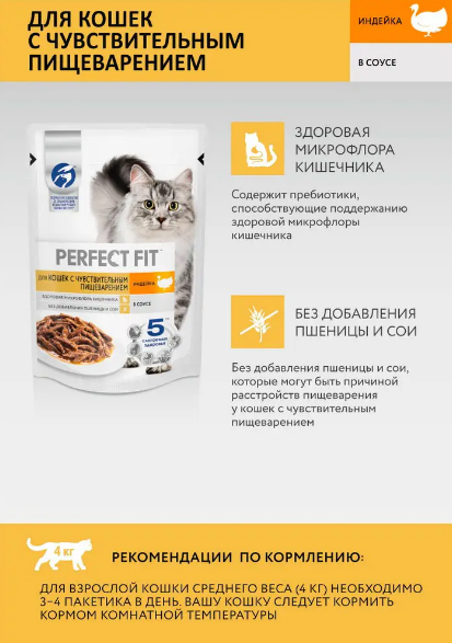 Влажный полнорационный корм PERFECT FIT для взрослых кошек с чувствительным пищеварением, с индейкой в соусе, 28 шт по 75 г. Влажный корм в паучах PERFECT FIT с индейкой в соусе для кошек с чувствительным пищеварением содержит пребиотики, способствующие поддержанию здоровой микрофлоры кишечника питомца. Здоровая микрофлора кишечника - Содержит пребиотики для поддержания здоровой микрофлоры кишечника Без добавления пшеницы и сои - Без добавления пшеницы и сои, которые могут быть причиной расстройств пищеварения у кошек с чувствительным пищеварением.