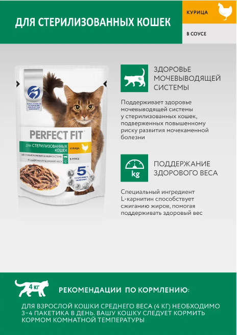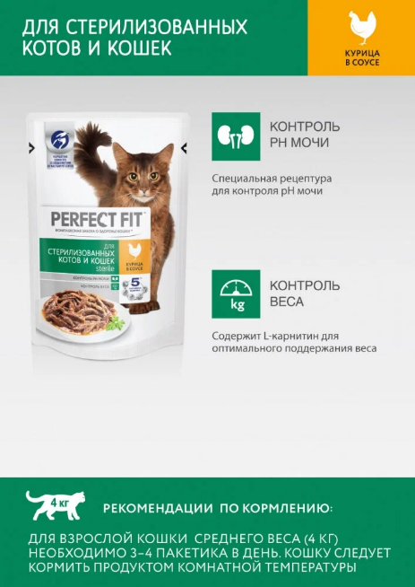 Полноценный сбалансированный рацион с курицей в соусе, созданный специально для котов и кошек после кастрации и стерилизации. НЕ содержит ароматизаторов, красителей И консервантов. Ключевые особенности: Поддержание здоровья мочевыводящих путей благодаря специальной рецептуре для контроля и поддержания в пределах рекомендуемой нормы pH мочи, а также благодаря высокому содержанию влаги в составе. Оптимальное поддержание веса, которому способствуют входящий в состав L-карнитин и сниженный уровень жиров. PERFECT FIT комплексная забота о здоровье Вашей кошки! 5 слагаемых здоровья рационов PERFECT FIT: Поддержание иммунитета благодаря входящим в состав витамину Е и цинку. Жизненная сила. Корм обогащен витаминами группы В и и железом для поддержания жизненной силы. Крепкие мышцы. Комбинация белков, минералов и витаминов для поддержания крепких мышц. Природная зоркость. Витамин А и таурин поддерживают остроту зрения Вашего питомца.