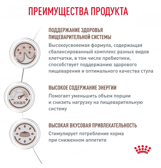 Консервированный корм ROYAL CANIN® GASTROINTESTINAL (ГАСТРОИНТЕСТИНАЛ), мелкие кусочки в соусе – это полнорационный диетический корм для кошек, рекомендуемый при расстройствах пищеварения, в период восстановления и при истощении. Легкоусвояемые ингредиенты. Дополнительное количество электролитов и высокое содержание основных питательных веществ. Высокая калорийность. Формула способствует поддержанию здорового пищеварения и оптимального качества стула. Высокое содержание энергии помогает уменьшить объем порции и снизить нагрузку на пищеварительную систему.