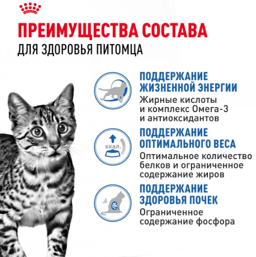Формула рациона ROYAL CANIN Indoor Sterilised 7+ (ИНДОР СТЕРИЛАЙЗД 7+) соответствует макронутриентному профилю, инстинктивно предпочитаемому кошками.