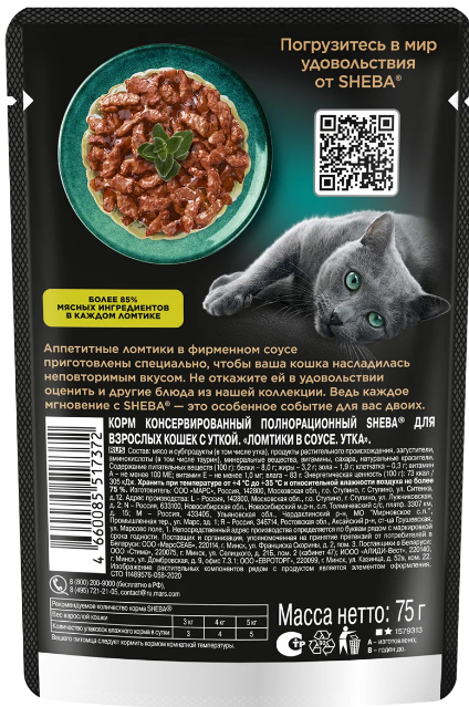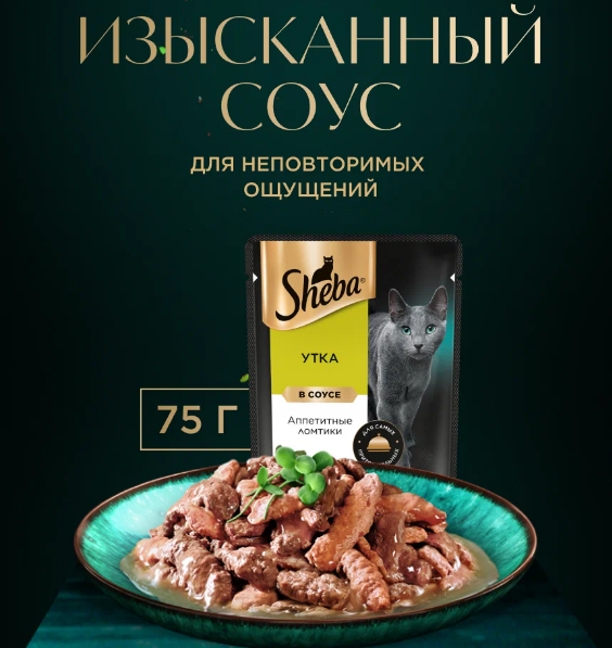 Паучи Шеба для кошек Утка ломтики в Соусе (цена за упаковку) - Эти сочные ломтики с уткой в фирменном соусе приготовлены специально, чтобы ваша любимая кошка насладилась неповторимым вкусом. Не откажите ей в удовольствии оценить и другие блюда из нашей коллекции. Ведь каждое мгновение с Sheba® – это особенное событие для вас двоих. Рекомендуется кормить кошку кормом комнатной температуры. Для взрослой кошки среднего веса (4 кг) необходимо 3-4 пакетика в день.