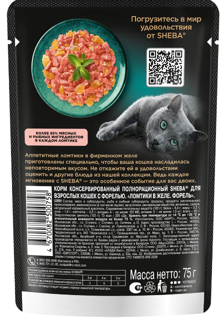 Сочные ломтики с форелью в ароматном желе - блюдо из высококачественных ингредиентов, которое придётся по вкусу самым притязательным кошкам. Мы приготовили его по особому рецепту, чтобы раскрыть всю красоту вкуса и сохранить баланс витаминов, минералов и аминокислот, необходимых вашей любимице. Подарите своей кошке особое удовольствие, побаловав ее всеми блюдами из коллекции SHEBA.