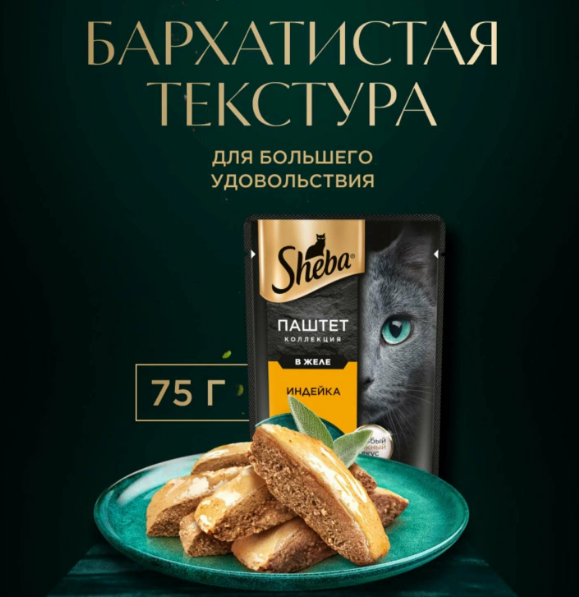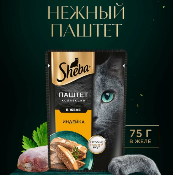 Паштет от Sheba - это новая линейка блюд, в которой мы воплотили всё, что так любит ваша кошка: нежный мясной паштет и тонкий слой ароматного желе.Состав: мясо и субпродукты (в том числе индейка), аминокислоты (в том числе таурин), загустители, минеральные вещества, свекловичный жом, сахара, витамины.Содержание питательных веществ (100 г): белки - 9,0 г; жиры - 3,0 г; зола - 1,5 г; клетчатка - 0,1 г; влага - 84 г.; витамин А - не менее 100 МЕ; витамин Е - не менее 1,0 мг. Энергетическая ценность (100 г): 70 ккал / 293 кДж.Рекомендуемое количество корма SHEBA (вес животного, кг – упаковок корма в сутки, шт): 3 кг – 3; 4 кг – 4; 5 кг – 5. Вашего питомца следует кормить кормом комнатной температуры.Хранить при температуре от + 4*С до + 35*С и относительной влажности воздуха не более 75 %.