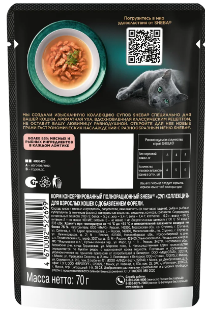 Влажный корм Sheba имеет высокую питательную ценность и содержит все необходимые витамины и минералы для здоровья вашего питомца. Он также обладает уникальной формой, которая поможет вашему питомцу легко пережевывать и проглатывать корм.