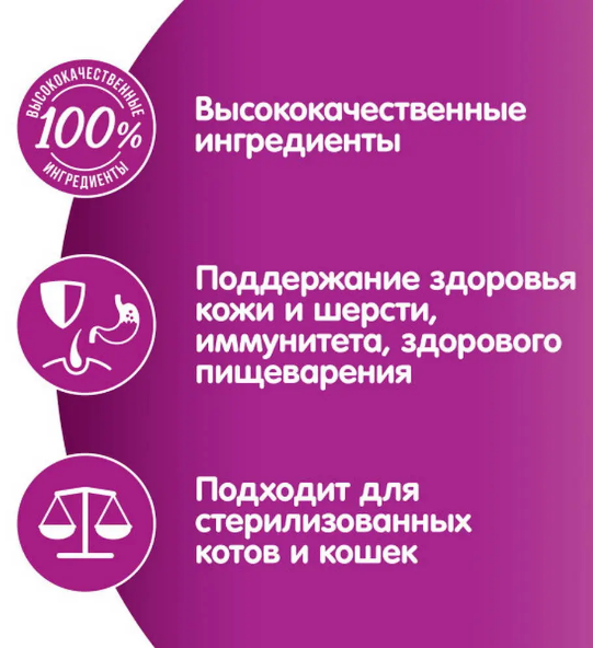 Все необходимое для поддержания здоровья вашей любимицы: Омега-6, кальций, фосфор, таурин, витамины D и Е, цинк.