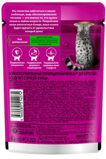 Это сбалансированный рацион, приготовленный так, как любит ваша кошка. Аппетитное рагу с курицей в густом соусе обязательно понравится вашей любимице. Жизнь замуррчательна, ведь рацион Whiskas содержит все необходимое, чтобы еда вашей кошки была не только вкусной, но и полезной. Whiskas поддержит иммунитет, позаботится о здоровом пищеварении и здоровье кожи и шерсти вашей кошки. Подходит для стерилизованных котов и кошек.