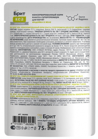 Вся линейка паучей и ламиcтеров Брит Кеа "Волокна в желе" построена на индейке как основном белке, с добавками разных морепродуктов. Это уникальная фишка линейки — моно-белковый состав на базе индейки + сочные волокна и желе, обогащенные спирулиной и таурином, создающие функциональное лакомство для взрослых кошек и котят.