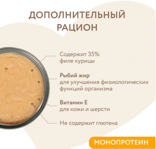 Содержит в составе натуральное мясо курицы, которое хорошо усваивается организмом и имеет высокую питательную ценность и вкусовую привлекательность.