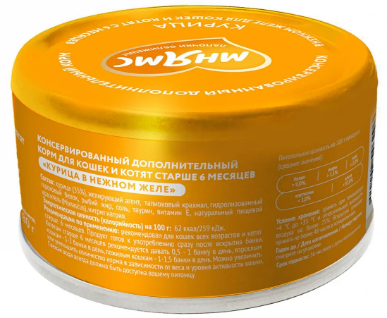 Консервированный дополнительный корм «Мнямс» для кошек и котят старше 6 месяцев «Курица в нежном желе" гарантирует, что ваш питомец получит только качественный и вкусный продукт, который прекрасно разнообразит его рацион, поддержит здоровье и обеспечит энергией.