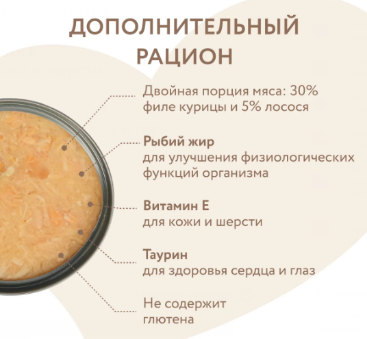 Содержит в составе натуральное мясо курицы и лосося, которое хорошо усваивается организмом и имеет высокую питательную ценность и вкусовую привлекательность.
