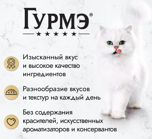 Влажный корм для взрослых кошек ГУРМЭ® создан специально для питомцев, которые ценят качество и разнообразие вкусов и текстур. ГУРМЭ® Перл Соус де-Люкс — это тщательно отобранные нежные кусочки мини-филе с лососем, телятиной, говядиной или курицей в роскошном ароматном соусе с шелковистой текстурой. Именно изысканный соус может придать невероятный вкус даже знакомому блюду. Эксперты в области кормов для домашних животных разработали специальные насыщенные соусы, с которыми любимые блюда обрели новое звучание. С кормом ГУРМЭ® Перл Соус де-Люкс Ваш пушистый друг прикоснется к настоящему кулинарному искусству. Корм для кошек ГУРМЭ® полнорационный, содержит все необходимые для здоровья микронутриенты. • Комбинация белков и углеводов обеспечивает энергией. • Клетчатка благотворно влияет на работу пищеварительной системы. • Восхитительный вкус удовлетворит самые утонченные предпочтения питомца. • Влажные корма ГУРМЭ® не содержат искусственных ароматизаторов и консервантов.