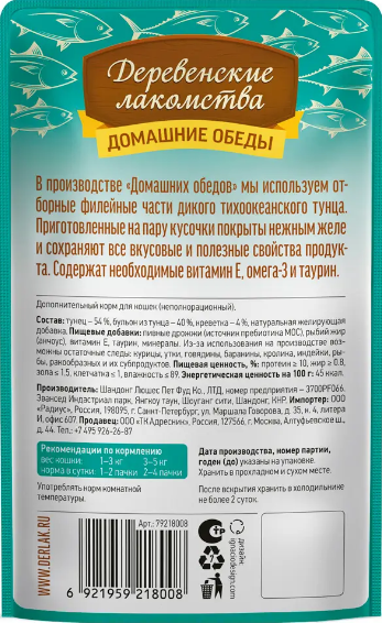 Консервированный влажный корм для кошек серии «Деревенские лакомства — Рыбные обеды» содержит большое количество мяса тихоокеанского тунца, чей вкус идеально сочетается с отборными креветками. Тёмное мясо тунца отличается нежной текстурой и более ярким ароматом, такое мясо насыщает корм вкусом морской рыбы. Подаётся в нежном желе, которое не только улучшает текстуру корма, но и способствует лучшему усвоению питательных веществ. Дополнительный (неполнорационный) корм для кошек.
