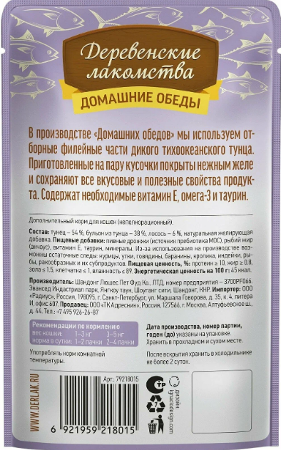 Деревенские лакомства д\кошек с тунцом и лососем в нежном желе пауч 70 гр.