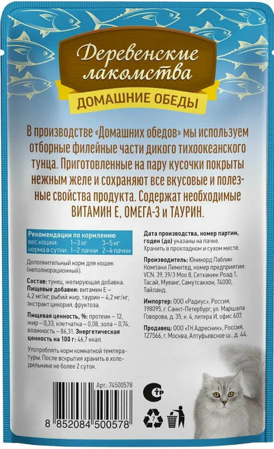 Деревенские лакомства д\кошек с филейным тунцом в нежном желе 70 гр.