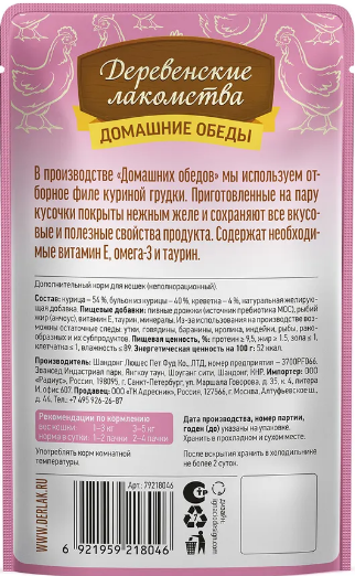 Консервированный влажный корм для кошек серии "Деревенские лакомства - Домашние обеды" - это полноценный обед из сочных, приготовленных на пару, кусочков курицы и цельных креветок. Откройте для своего кота мир гастрономических удовольствий с каждым кусочком. Насыщенный природный вкус без усилителей вкуса и консервантов, для тех, кто ценит здоровое питание. Легкая текстура желе облегчает процесс потребления, делая этот продукт идеальным даже для самых привередливых питомцев. Побалуйте своего любимца изысканным и полезным лакомством!