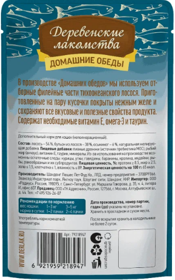 "Домашние обеды" - это не просто корм, это настоящее лакомство для вашего питомца. В составе консервов содержится лосось и осьминог, которые являются источником белка и полезных микроэлементов. Благодаря этому, ваш питомец получит все необходимые питательные вещества и будет чувствовать себя здоровым и активным.