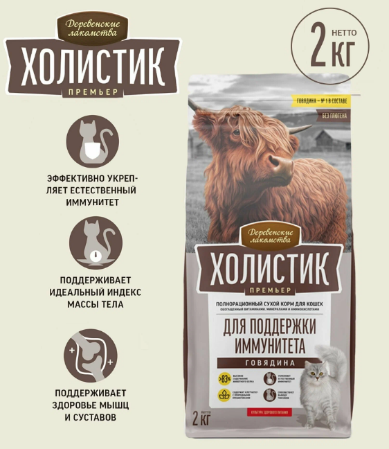 Одно из правил обеспечения высокого иммунитета кошки – сбалансированное питание. Полнорационный сухой корм «Холистик Премьер. Для поддержки иммунитета. Говядина» богат белком отборной говядины, жизненно-важными витаминами, минералами и аминокислотами. Этот рецепт обеспечивает питомца всем необходимым для поддержания великолепной физической формы, крепкого природного иммунитета и, свойственной кошкам, высокой активности. Идеально подойдёт для кошек, живущих в квартире.