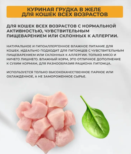Натуральное и гипоаллергенное влажное питание для кошек. Идеально подходит для питомцев с чувствительным пищеварением или склонных к аллергии. Только мясо и ничего лишнего. Влажный корм, это отличное дополнение к сухим кормам, для разнообразия рациона питомца.