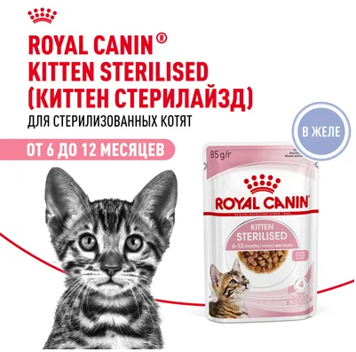 Корм консервированный полнорационный для кошек - Специально для кастрированных и стерилизованных котят (в возрасте от 6 до 12 месяцев) KITTEN STERILISED (КИТТЕН СТЕРИЛАЙЗД), мелкие кусочки в желе ROYAL CANIN®.