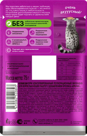 Аппетитный паштет с кроликом подарит вашей любимице настоящее удовольствие. Рацион Whiskas® содержит все необходимое, чтобы еда вашей кошки была не только вкусной, но и полезной. Whiskas® поддержит иммунитет, позаботится о здоровом пищеварении и здоровье кожи и шерсти вашей кошки. Подходит для стерилизованных котов и кошек.