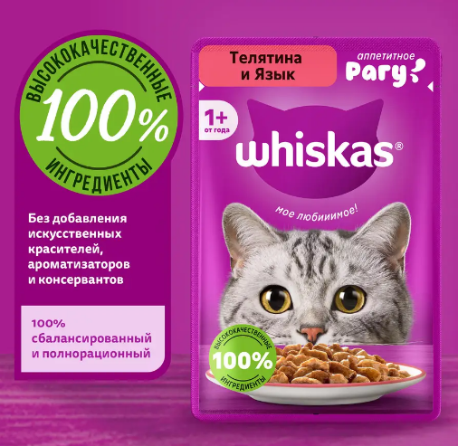Аппетитное рагу с телятиной и языком в густом соусе обязательно понравится вашей любимице. Рацион Whiskas® содержит все необходимое, чтобы еда вашей кошки была не только вкусной, но и полезной. Whiskas® поддержит иммунитет, позаботится о здоровом пищеварении и здоровье кожи и шерсти вашей кошки. Подходит для стерилизованных котов и кошек.