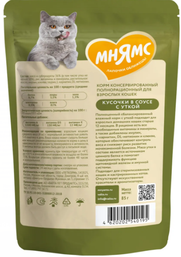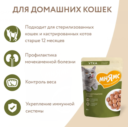 Высококачественный полнорационный сбалансированный влажный корм с уткой подходит для взрослых домашних кошек старше 12 месяцев.
