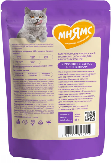 Высококачественный полнорационный сбалансированный влажный корм с ягненком подходит для взрослых активных кошек старше 12 месяцев.