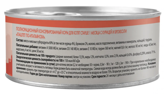 Полнорационный сбалансированный влажный корм с курицей и брокколи для котят старше 1 месяца, созданный по мотивам блюд высокой кухни. "Паштет по-итальянски" содержит высокое количество животного белка (69%), молоко, кальций, таурин, а также все необходимые витамины и минералы, обеспечивающие рост и правильное развитие котенка.