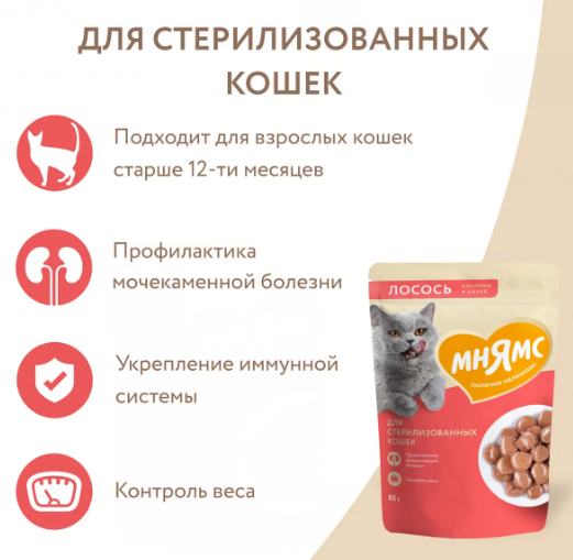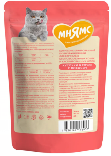 Мнямс Кусочки в соусе с лососем для стерилизованных кошек 85г