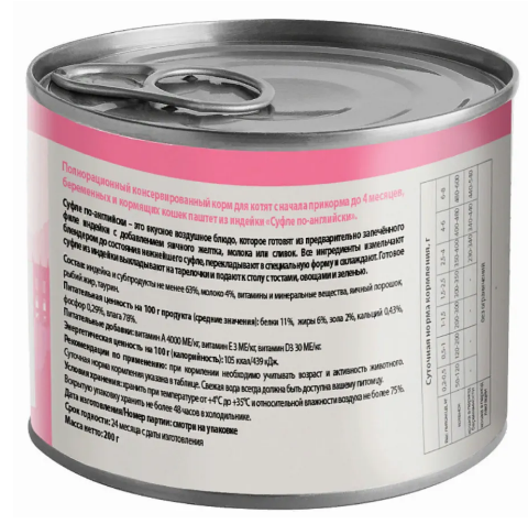 Полнорационный суперпремиальный паштет "Суфле по-английски" с высоким содержанием мяса, созданный по мотивам культовых рецептов разных стран, адаптированных под потребности домашних питомцев, подходит для котят всех пород с момента прикорма и до 4 месяцев, беременных и кормящих кошек. Кошачий корм влажный содержит в своем составе компоненты: индейка и субпродукты не менее 63%, молоко 4%, витамины и минеральные вещества, яичный порошок, рыбий жир, таурин.