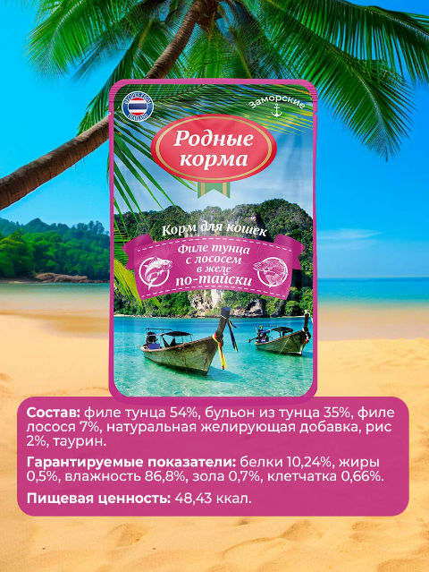 РОДНЫЕ КОРМА 70 г заморские паучи для кошек филе тунца с курицей и лососем в желе по-тайски