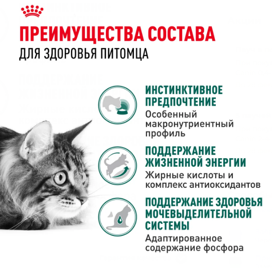 ROYAL CANIN Instinctive 7+ (ИНСТИНКТИВ 7+) содержит жирные кислоты Омега-3 (EPA и DHA) и комплекс антиоксидантов, в том числе витамины С, Е для поддержания здоровья и жизненной энергии кошек.