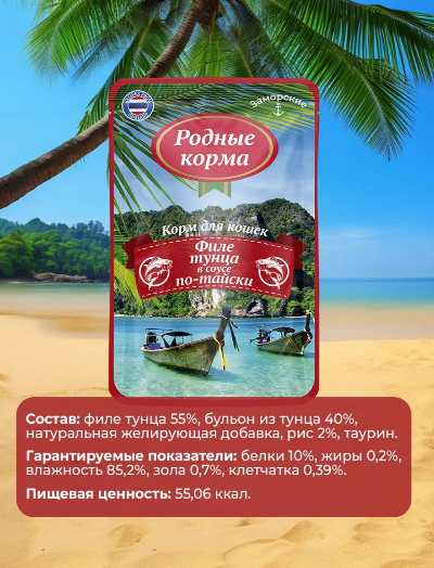 РОДНЫЕ КОРМА 70 г заморские паучи для кошек филе тунца в соусе по-тайски