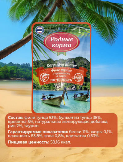 РОДНЫЕ КОРМА 70 г заморские паучи для кошек филе тунца с креветками в соусе по-тайски