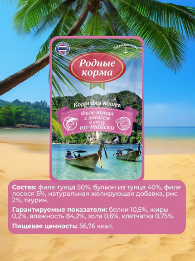 РОДНЫЕ КОРМА 70 г заморские паучи для кошек филе тунца с лососем в соусе по-тайски