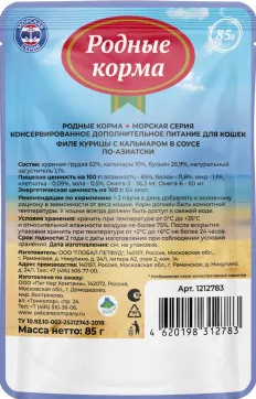 Родные корма морская серия – линейка российских кормов самого высочайшего и исключительного качества. При производстве применяется специальная технология, которая позволяет сохранить волокнистую структуру мяса. Откройте для своего пушистого друга мир морских деликатесов с новой линейкой влажных кормов «Морская серия» филе курицы с кальмаром в соусе по-азиатски!