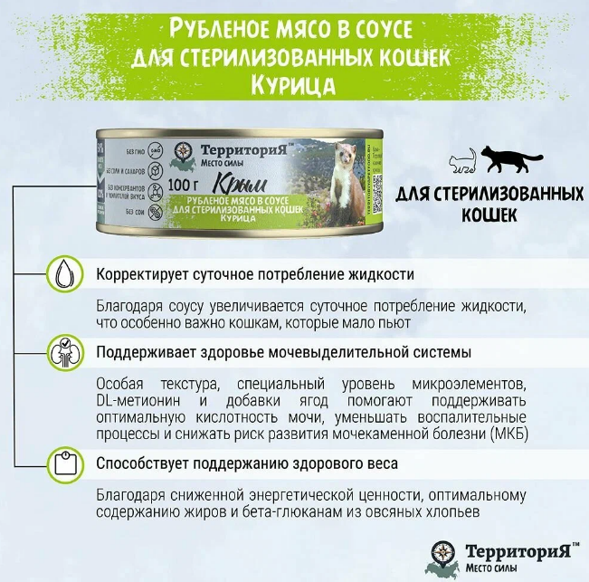 Полнорационный влажный корм суперпремиум класса для взрослых стерилизованных кошек. Благодаря соусу увеличивается суточное потребление жидкости, что особенно важно кошкам, которые мало пьют. Особая текстура, специальный уровень микроэлементов, DL-метионин и добавки ягод помогают поддерживать оптимальную кислотность мочи, уменьшать воспалительные процессы и снижать риск развития мочекаменной болезни (МКБ). Благодаря сниженной энергетической ценности, оптимальному содержанию жиров и наличию бета-глюканов из овсяных хлопьев, корм способствует поддержанию здорового веса кошки. Состав корма включает в себя лишь те продукты, которые используются в натуральном питании животных. Основной ингредиент корма – индейка — одно из самых полезных и диетических видов птичьего мяса. Консервы не содержат искусственных желирующих добавок, красителей и консервантов. Мясо готовят в собственном соку, поэтому консервы получаются сочными, нежными и ароматными, как если бы вы сделали их дома. Без ГМО. Без добавления соли и сахаров. Без красителей, усилителей вкусов, консервантов.