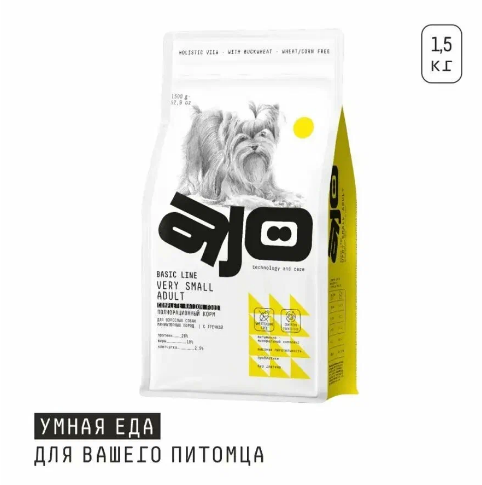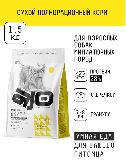 AJO Dog Very Small Adult Сухой полнорационный корм с гречкой для взрослых собак миниатюрных пород - Высокая питательность и большое количество белка для восполнения энергопотерь, характерных для собак миниатюрных пород. Ингредиенты: дегидрированное мясо (индейка 18%, курица 10%, ягненок 5%), рис, жир животный, гречневая крупа, хлопья овсяные, картофель, гидролизованные мясные белки (вкусоароматическая добавка), дрожжи пивные сухие, морковь, мускатная тыква, семена льна, жир лососевый 0,8%, брокколи, экстракт юкки Шидигера, пастернак, цикорий (источник инулина), лютеин (экстракт бархатцев), экстракт зеленого чая (источник полифенолов), минералы, комплекс витаминов: А, D, Е, С, холин хлорид (В4), никотиновая кислота (В3), пантотеновая кислота (В5), рибофлавин (В2), пиридоксин (В6), тиамин (В1), фолиевая кислота (Вс), биотин (Н), цианокобаломин (В12).
