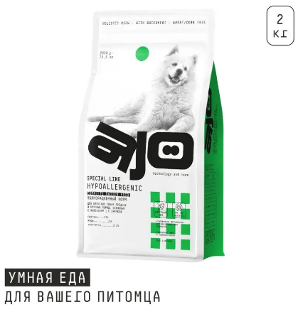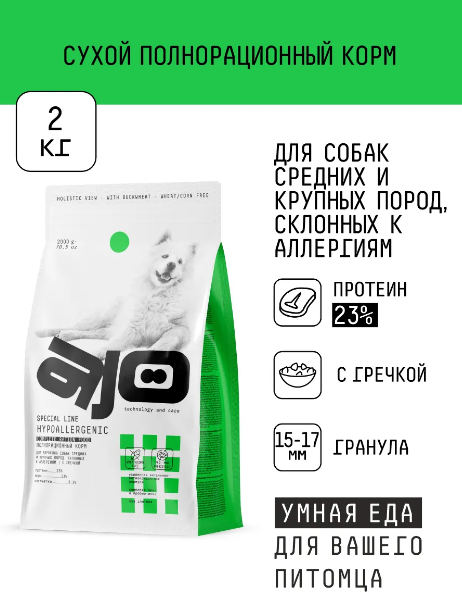 AJO Dog Hypoallergenic Сухой корм с гречкой для взрослых собак средних и крупных пород склонных к аллергиям 2кгAJO — это полезный, сбалансированный корм для кошек и собак супер-премиум класса, созданный в парадигме HOLISTIC VIEW. При создании корма мы использовали целостный подход и соединили последние научные достижения и базовые принципы правильного питания питомцев.Выверенные формулы учитывают физиологические параметры, этапы жизни, особенности обмена веществ и генетически обусловленные потребности питомцев.Легкоусвояемые белки, отсутствие глютена и комплекс про- и пребиотиков для профилактики проявлений аллергии и нормализации пищеварения.C ГречкойГречиха — одна из самых полезных круп, имеет высокую питательность, гипоаллергенность, антитоксические свойства, богата железом, магнием, калием, фосфором, витаминами группы ВC РисомБлагоприятное влияние на кишечник за счёт обволакивающих свойств, укрепляет сердце и сосуды, богат железом и цинком, содержит клетчатку и важные для здоровья питомца аминокислоты.Без кукурузыВместо пшеницы и кукурузы в составе присутствует рис/гречка в качестве источников углеводов.