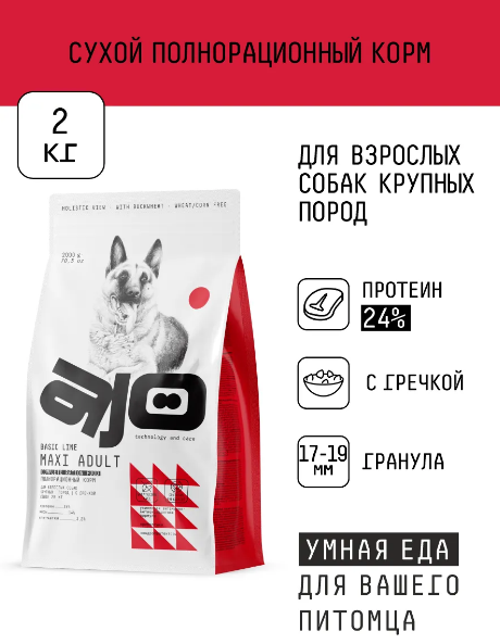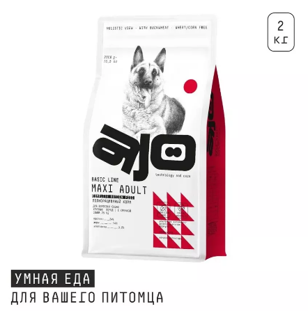 AJO (АЙО, АДЖО) Dog Maxi Adult Сухой полнорационный корм с гречкой для взрослых собак крупных пород 2 кг. Оптимальное сочетание питательных веществ, витаминов и минералов для поддержания хорошей физической формы и профилактики болезней суставов и костей собак крупных пород.