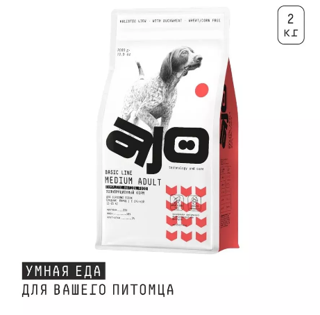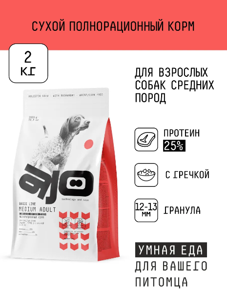 AJO (АЙО, АДЖО) Dog Medium Adult Сухой полнорационный корм с гречкой для взрослых собак средних пород 2 кг. Здоровая кожа, красивая шерсть, а также крепкий иммунитет за счет оптимального сочетания витаминов, минералов и питательных веществ, удовлетворяющих потребностям взрослых собак средних пород.