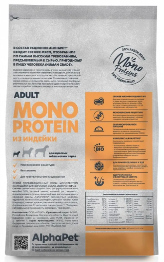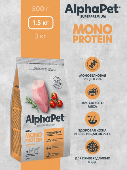AlphaPet MONOPROTEIN - благодаря единственному источнику животного белка, подойдет животным с пищевой непереносимостью. Индейка богата высокоусвояемым белком, фосфором и железом.