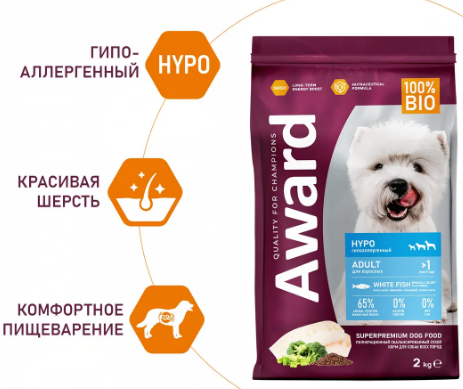 AWARD HYPO для взрослых собак всех пород с белой рыбой 2кг