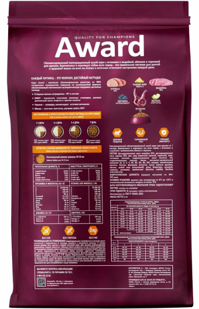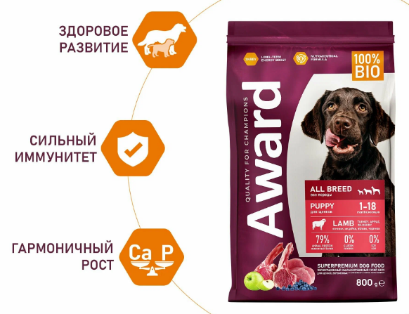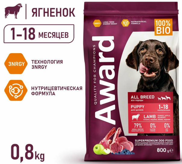 Сухой корм AWARD для щенков от 1 месяца, беременных и кормящих сук всех пород с ягненком и индейкой с добавлением яблока и черники 800 г.