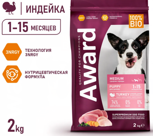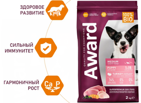 AWARD для щен. от 1 мес, берем. и корм. сук сред. пор. с инд. и куриц. 2кг